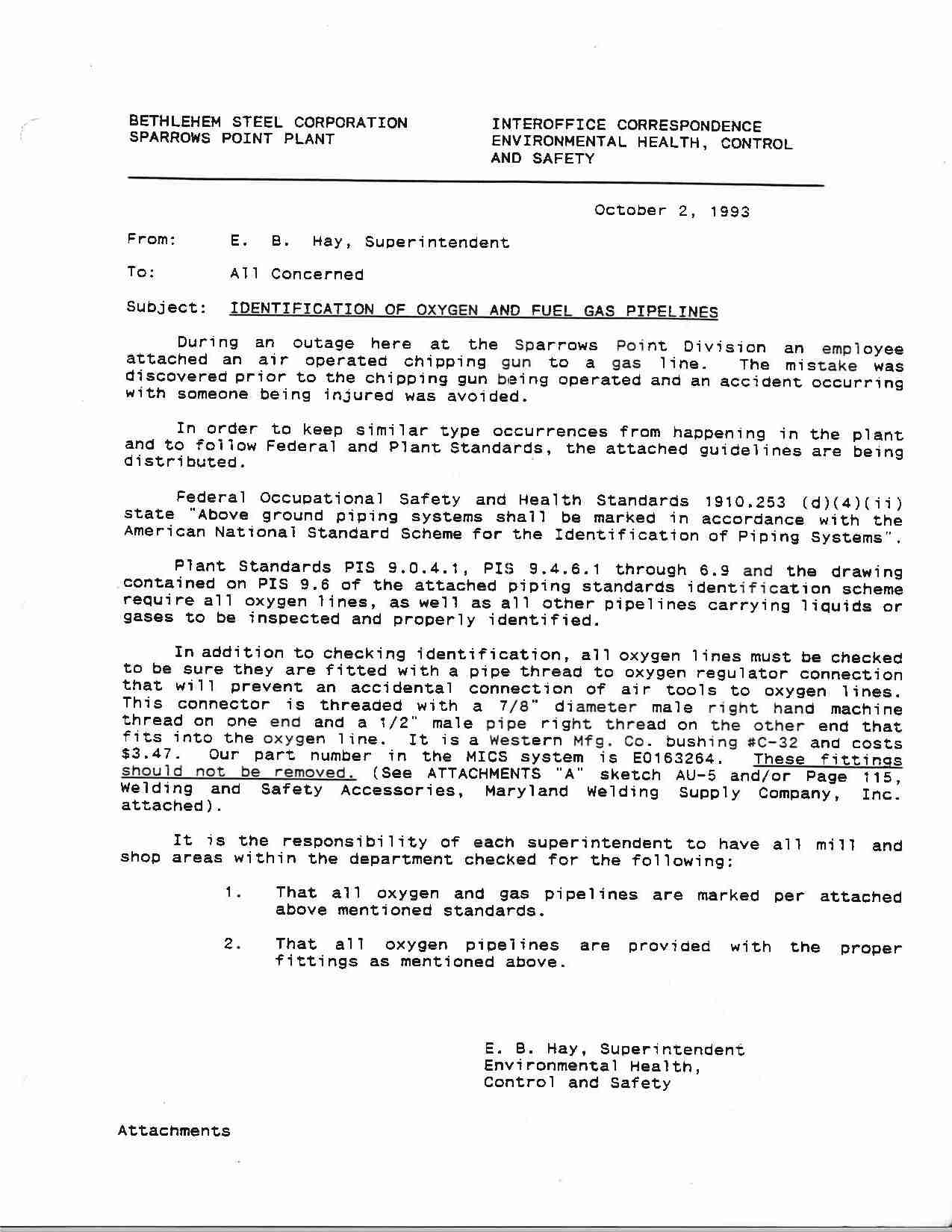 - A message from the Superintendent of Environmental Health, Control and Safety. Along with this document were pages of instructions about how gasoline pipes should be marked and handled in the plant.