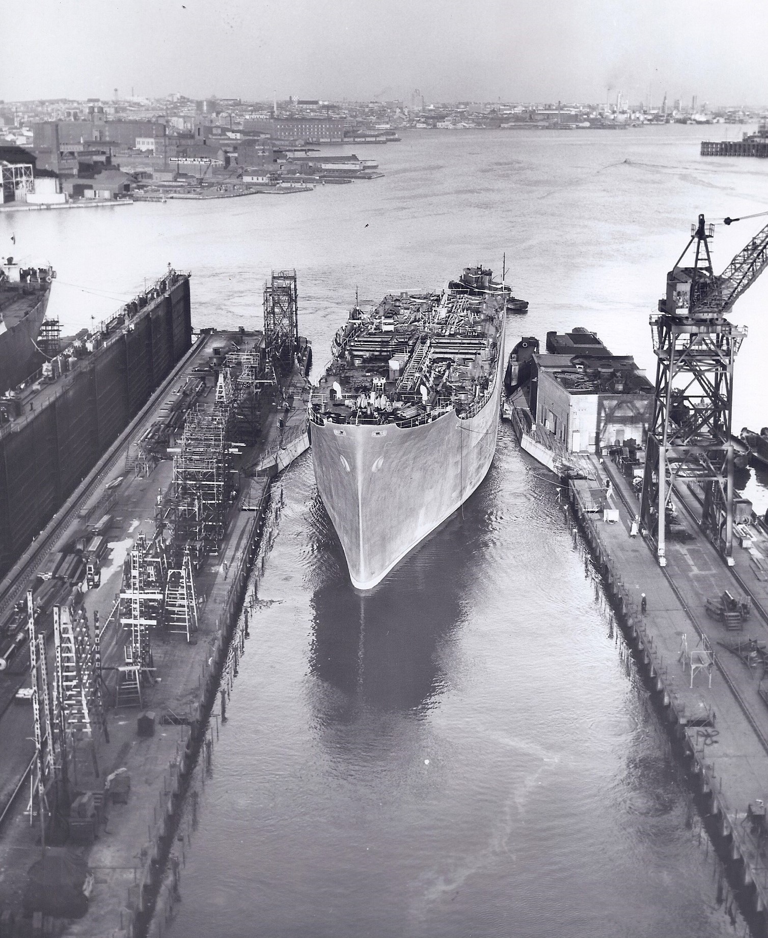 In 1957 workers at the Baltimore Yards pioneered a process that Bethlehem referred to as “jumboizing” a vessel. This involved cutting and separating the vessel at midbody and putting in place a new, larger midsection, thereby increasing the cargo carrying capacity of the ship at a fraction of the cost of building a new one. The first ship to undergo this procedure was the Gulf Meadows. The conversion of this T2 tanker increased the vessel’s petroleum carrying capacity from 140,000 to 175,00 barrels and extended its life by 12-15 years. The conversion took 36 days compared to the 18 months it would have taken to plan and deliver a new tanker of comparable size.