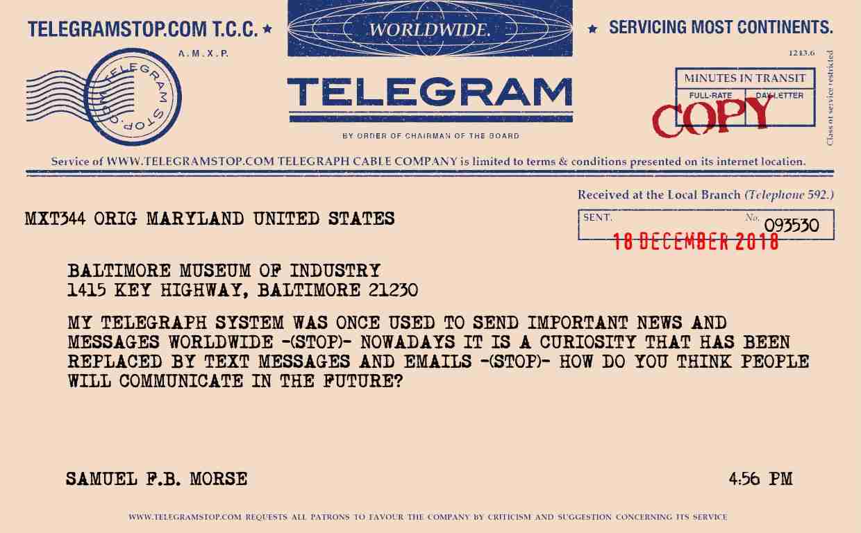 Sent by inventor Samuel F.B. Morse from the U.S. Capitol Building some 40 miles away, the first telegram ushered in the instantaneous communication that we take for granted today. Baltimore companies such as Western Electric, C&P Telephone, and Bendix Radio continued to leave their imprint on the world of telecommunications in the decades that followed. To learn more about the impact of the telegraph and other innovations in Baltimore, please visit the BMI’s long-term exhibit Tap, Talk, Text: Telecommunication in Maryland.