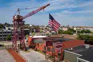 At 104-feet tall, the 1942 behemoth is dubbed a “whirley crane” for its ability to turn 360 degrees. This Bethlehem Steel Clyde Model 17 DE 90 crane was instrumental in Bethlehem Steel’s prolific World War II shipbuilding effort. The crane’s unique full rotation feature allowed it to help the Bethlehem Steel Fairfield shipyard hit record-breaking production numbers of Liberty and Victory ships during the war. With more than 44,000 workers and dozens of whirley cranes, the yard was building one vessel per month by mid-1943, and launching an average of one ship every thirty-five hours.