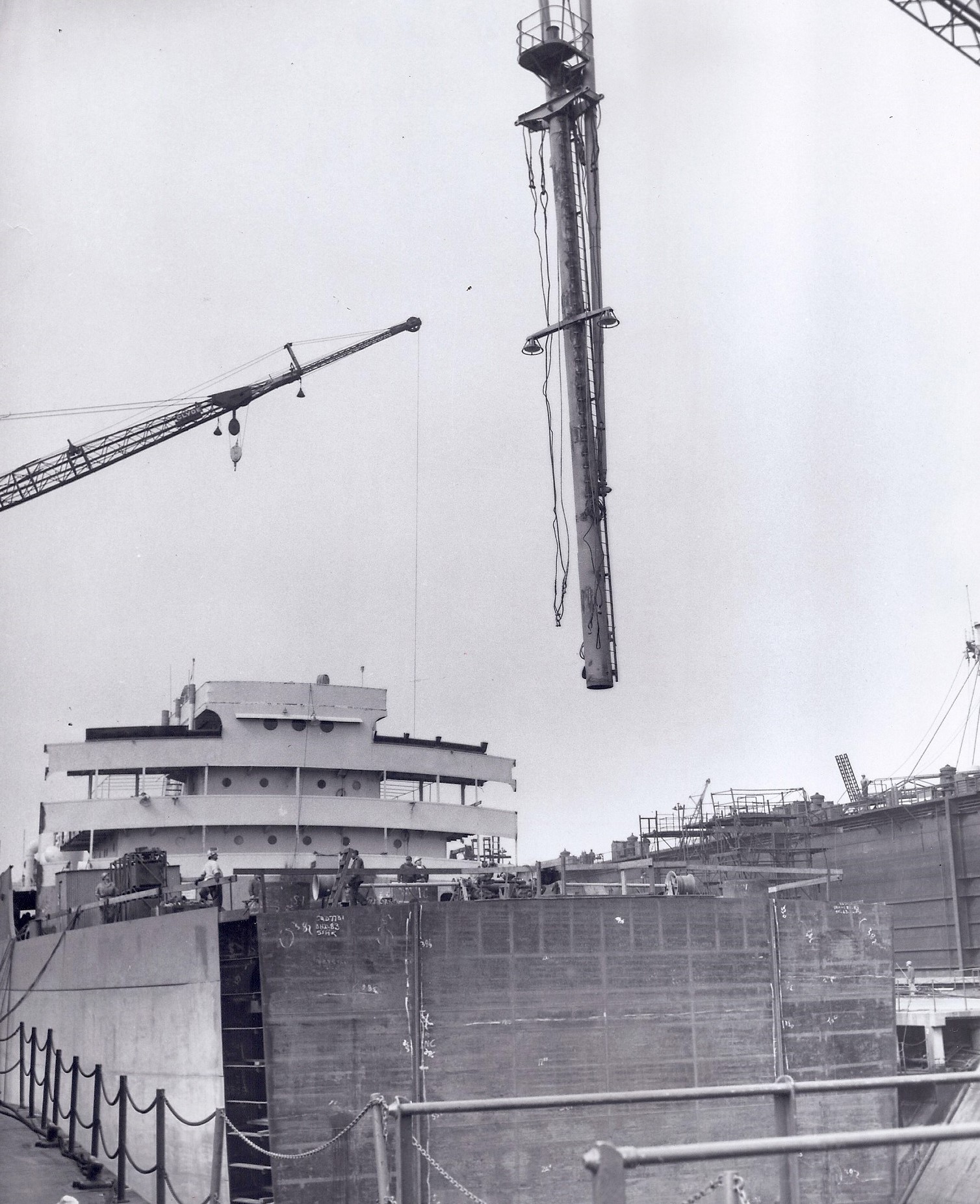 In 1957 workers at the Baltimore Yards pioneered a process that Bethlehem referred to as “jumboizing” a vessel. This involved cutting and separating the vessel at midbody and putting in place a new, larger midsection, thereby increasing the cargo carrying capacity of the ship at a fraction of the cost of building a new one. The first ship to undergo this procedure was the Gulf Meadows. The conversion of this T2 tanker increased the vessel’s petroleum carrying capacity from 140,000 to 175,00 barrels and extended its life by 12-15 years. The conversion took 36 days compared to the 18 months it would have taken to plan and deliver a new tanker of comparable size.